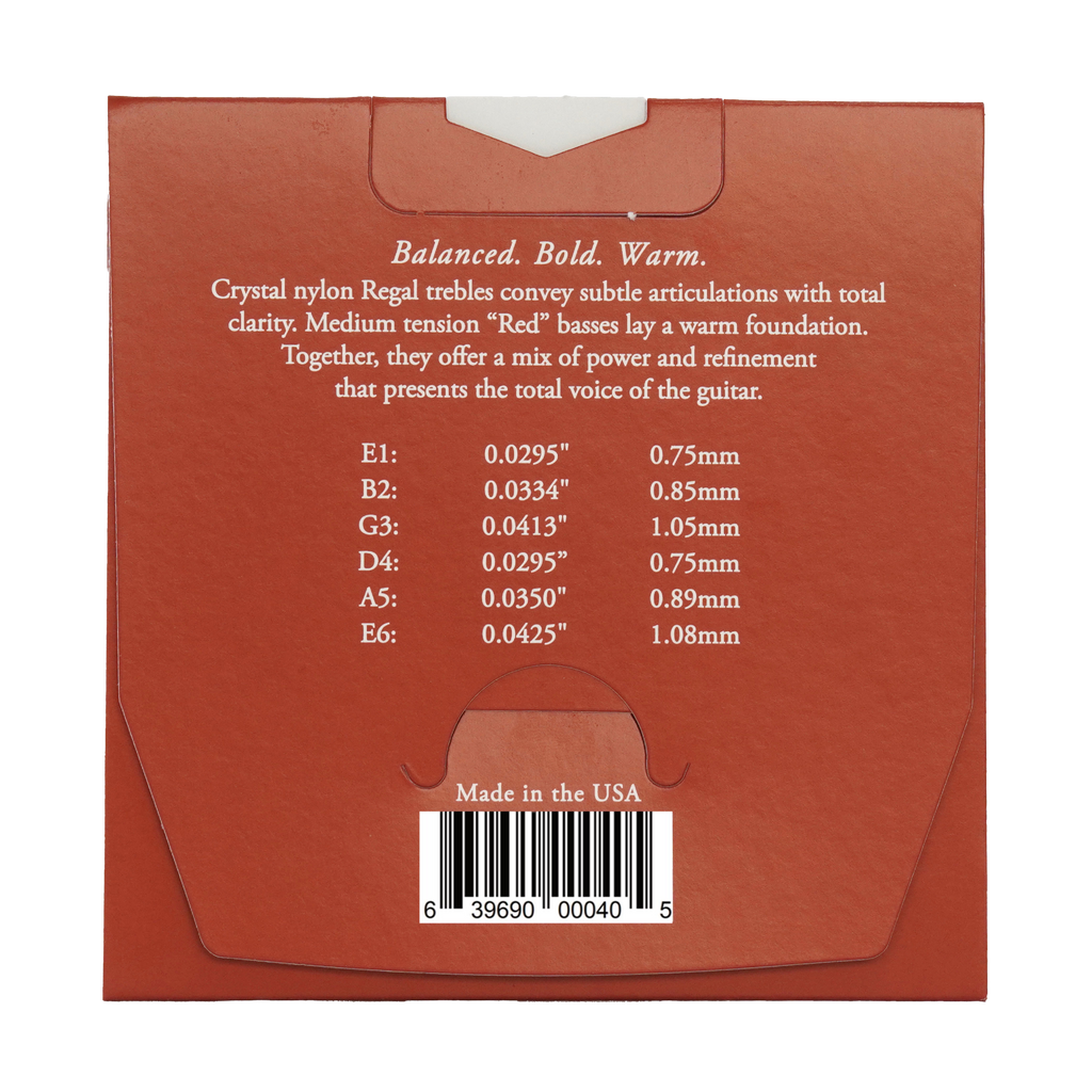 Crystal nylon Regal trebles convey subtle articulations with total clarity. Medium tension "Red" basses lay a warm foundation beneath the high tension crystal trebles. Together, they offer a mix of power and refinement that presents the total voice of the guitar.